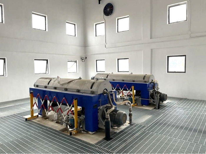 The centrifugal dewaterer is mainly composed of transfer and screw conveyor with hollow rotating shaft. After the sludge is sent into the rotary drum by hollow rotating shaft, under the action of centrifugal force generated by high-speed rotation, it is immediately thrown into the hub cavity. The proportion of sludge particles is larger, so the centrifugal force is also larger, which is used to stick on the inner wall of the hub, forming a solid layer: Water density is small, centrifugal force is small, only in the solid layer inside the liquid layer, the solid layer of sludge in the spiral conveyor slowly push, is transported to the cone end of the transfer, by the transfer around the outlet continuous discharge, liquid is discharged from the weir four overflow to transfer outside, the collection back out of the dehydrator.